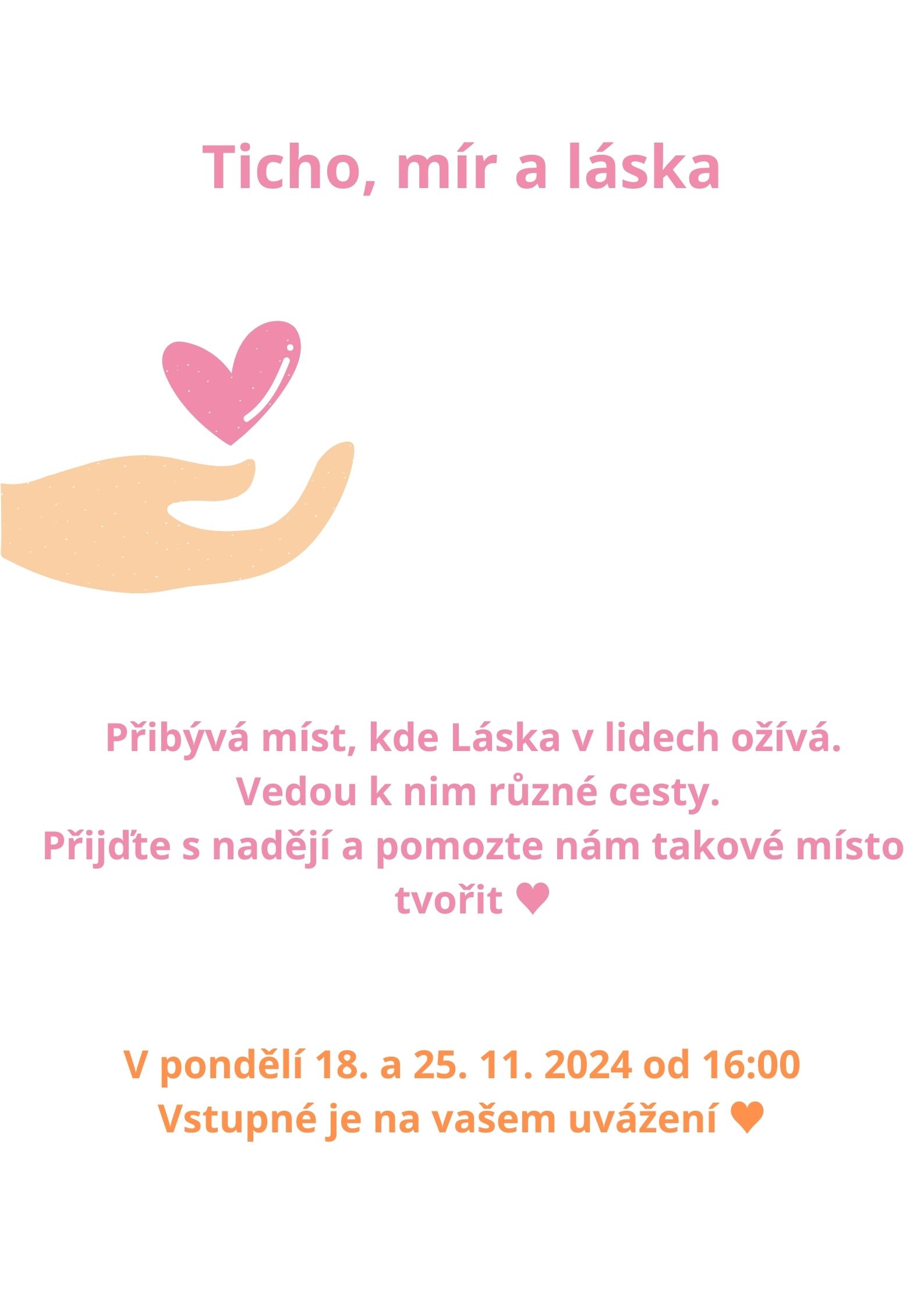 Ticho, mír a láska Vážení rodiče a další zájemci, vyslyšeli jsme vaše přání a přidáváme ještě dvě pondělní setkání. Přijít může každý, kdo chce s námi tvořit mír, ticho a lásku. Těšíme se na vás. MŠ Montessori2024-10-20T13:01:41+02:0020.Říj, 2024|